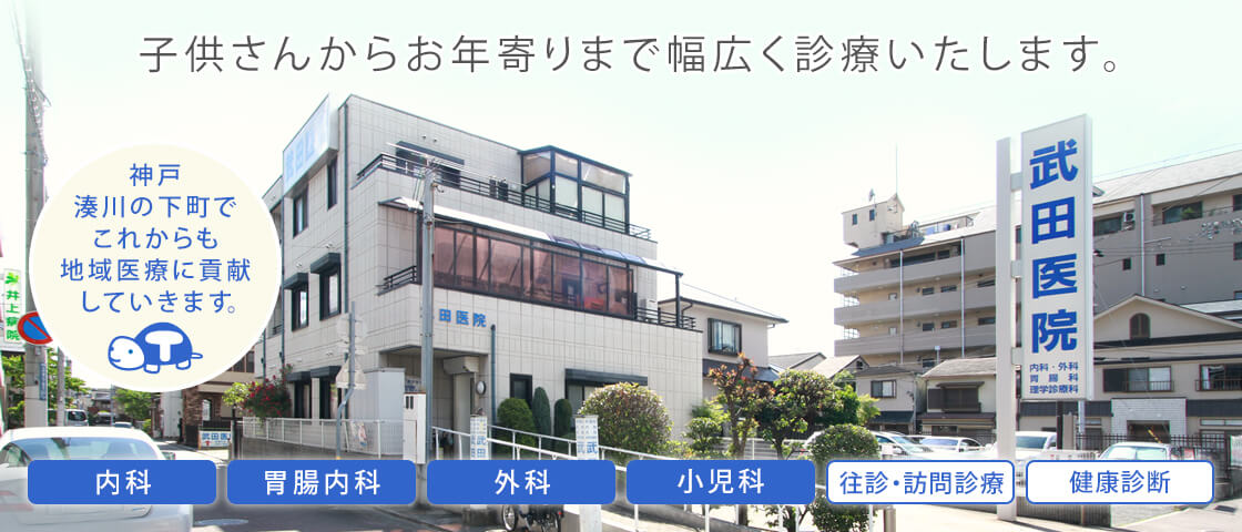神戸の下町にある診療所です。院長は在宅医療を、副院長は1歳以上の子どもの患者さまも診察しています。